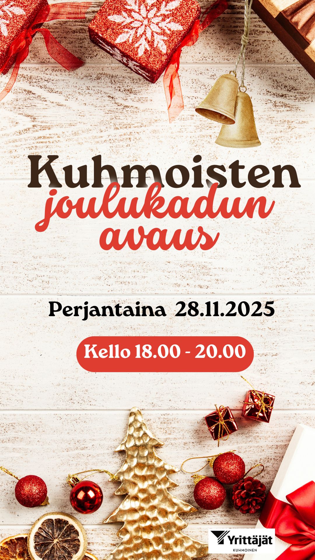 Tervetuloa Kuhmoisten perinteiseen joulukadun avaukseen perjantaina 28.11.2025 klo 18 alkaen. Ohjelmassa mm. Toritien valojen sytytys, arvontoja hienoine palkintoineen sekä myyjäiset. Tarjolla myös maukasta puuroa koko perheelle!